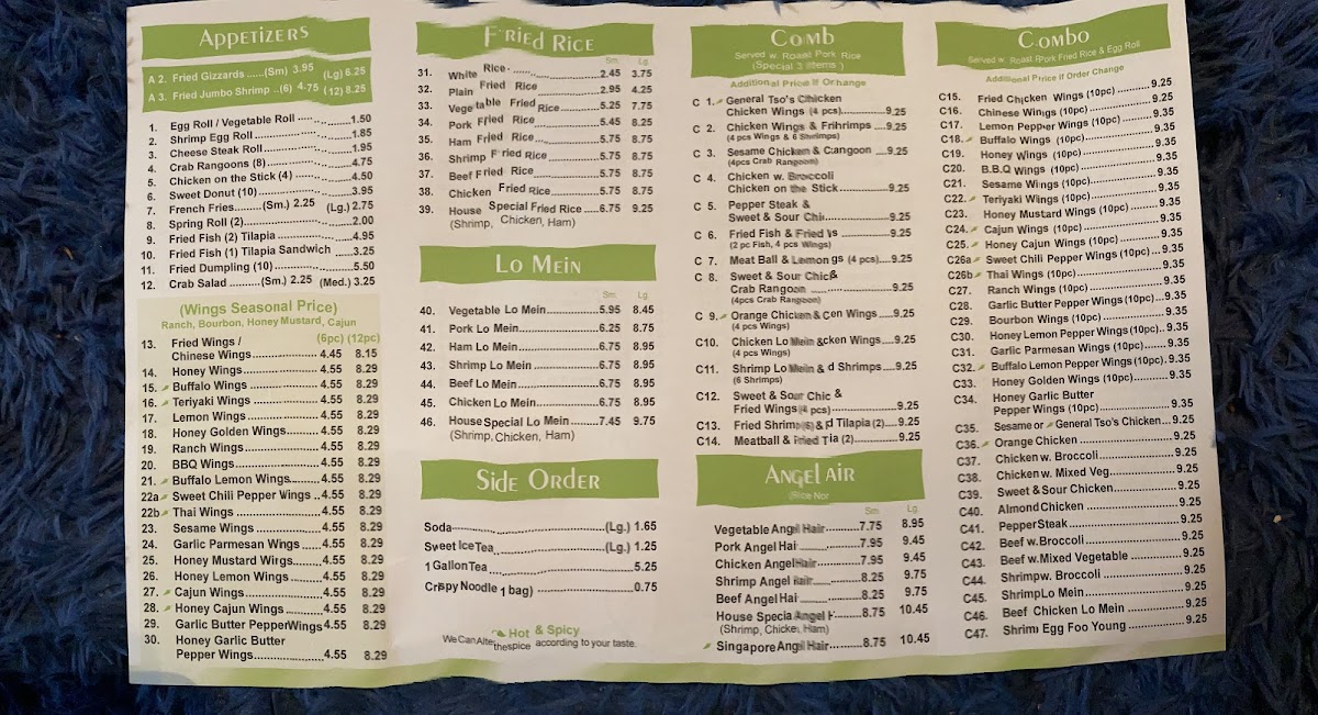“ It's a typical Chinese food restaurant with some additional items (multiple flavored wing options, gizzards, fried fish, etc). It is difficult to call in an order during peak times (lunch and dinner). The food is hot and ready in a few minutes. I don't like announcing my phone number in front of strangers to claim my order, but that is their system. Only once did I have food that didn't taste fresh. Watch out for multiple huge potholes in their parking lot. ”